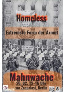 Vier Jahre bevor die Wohnungslosigkeit laut EU-Vorgaben beendet sein soll, veranstaltet das Bündnis gemeinsam gegen Obdachlosigkeit und Zwangsräumung am 26. Februar 2026 vor dem Zoopalast Berlin eine stille Mahnwache. Zum Anlass nimmt das Bündnis die Zwangsräumung von Daniel Z.